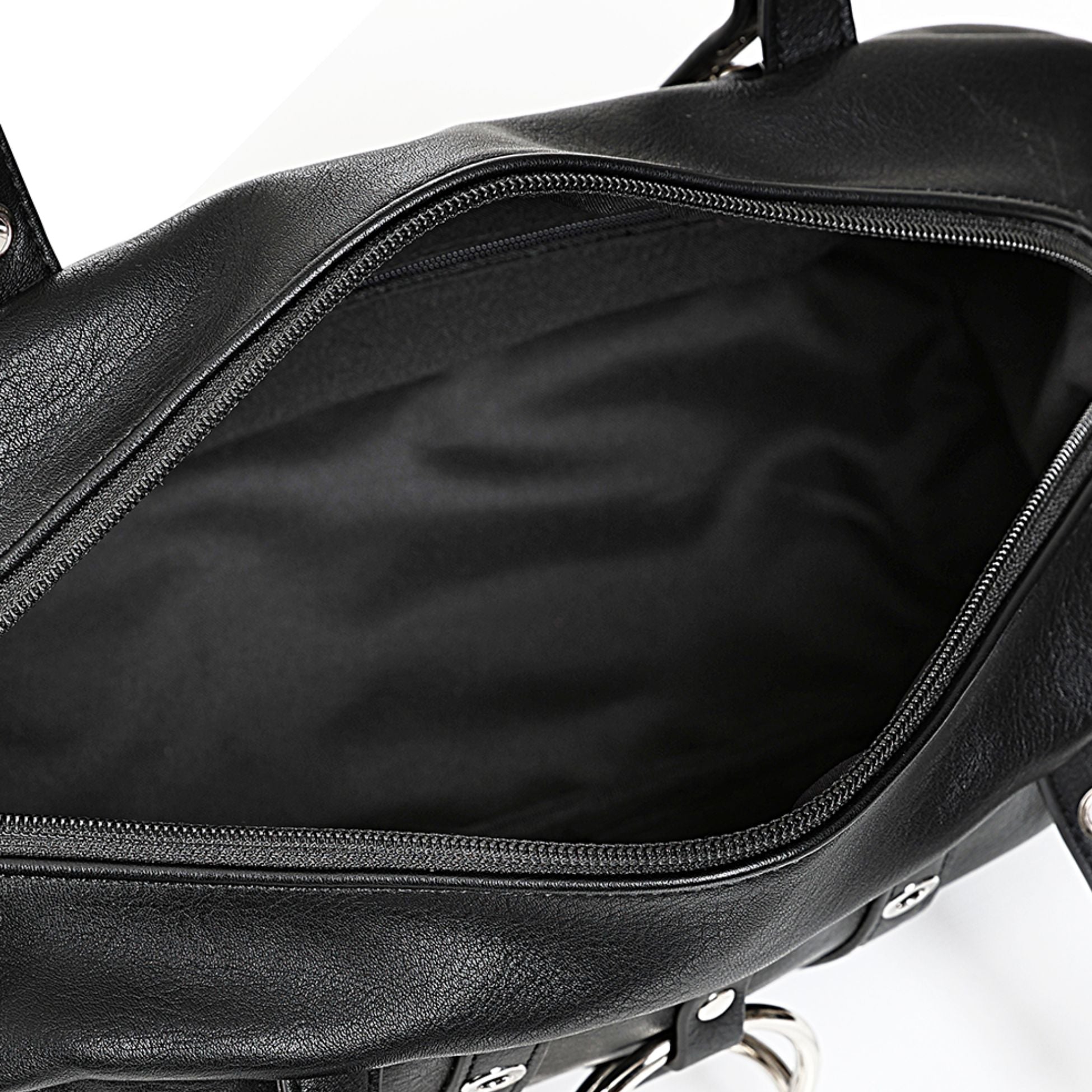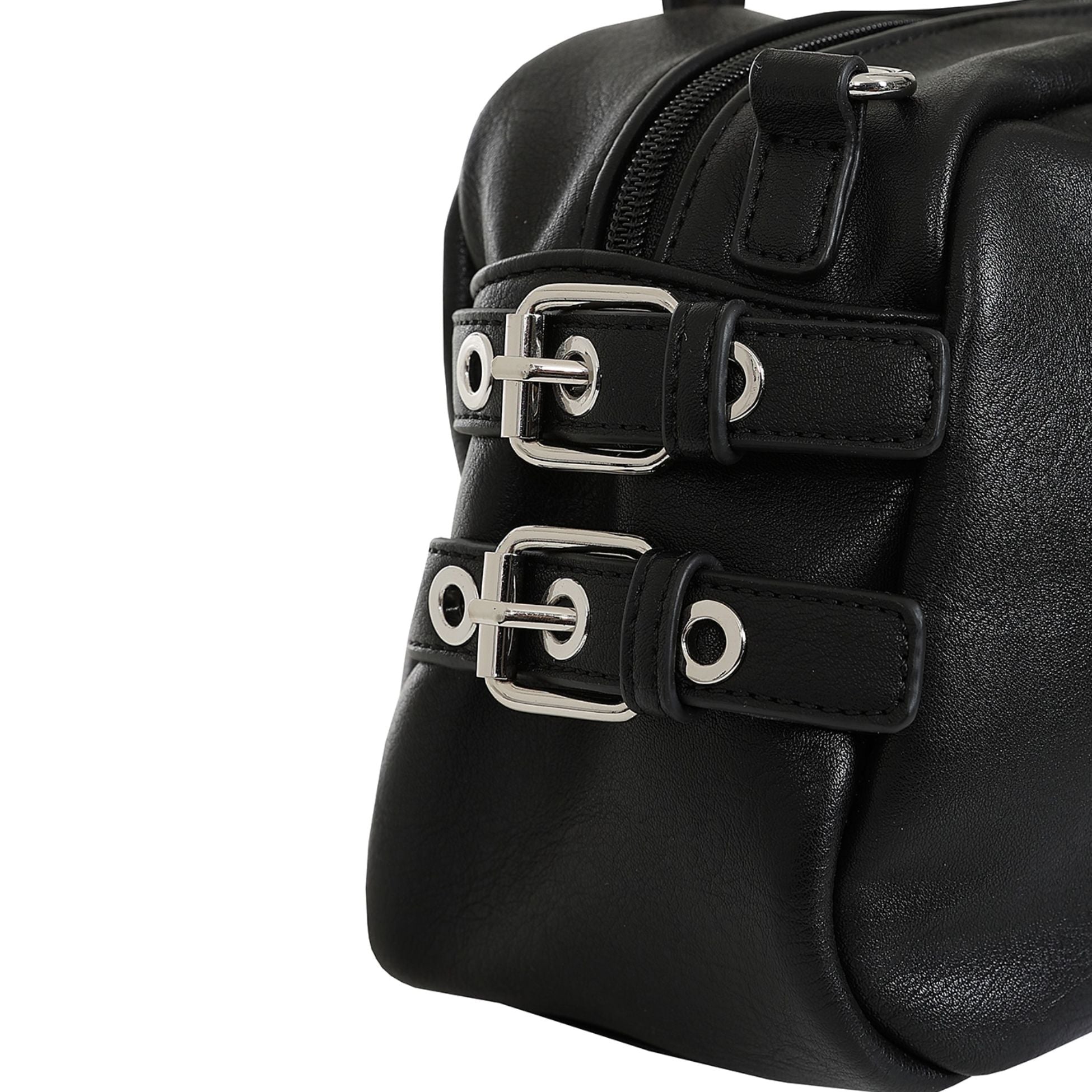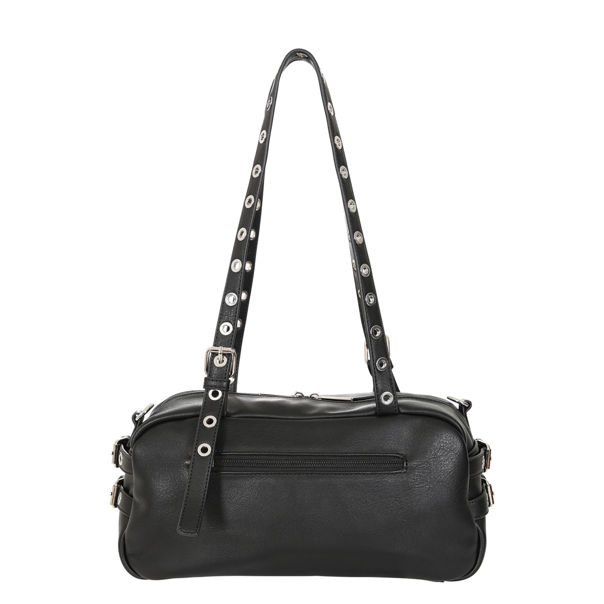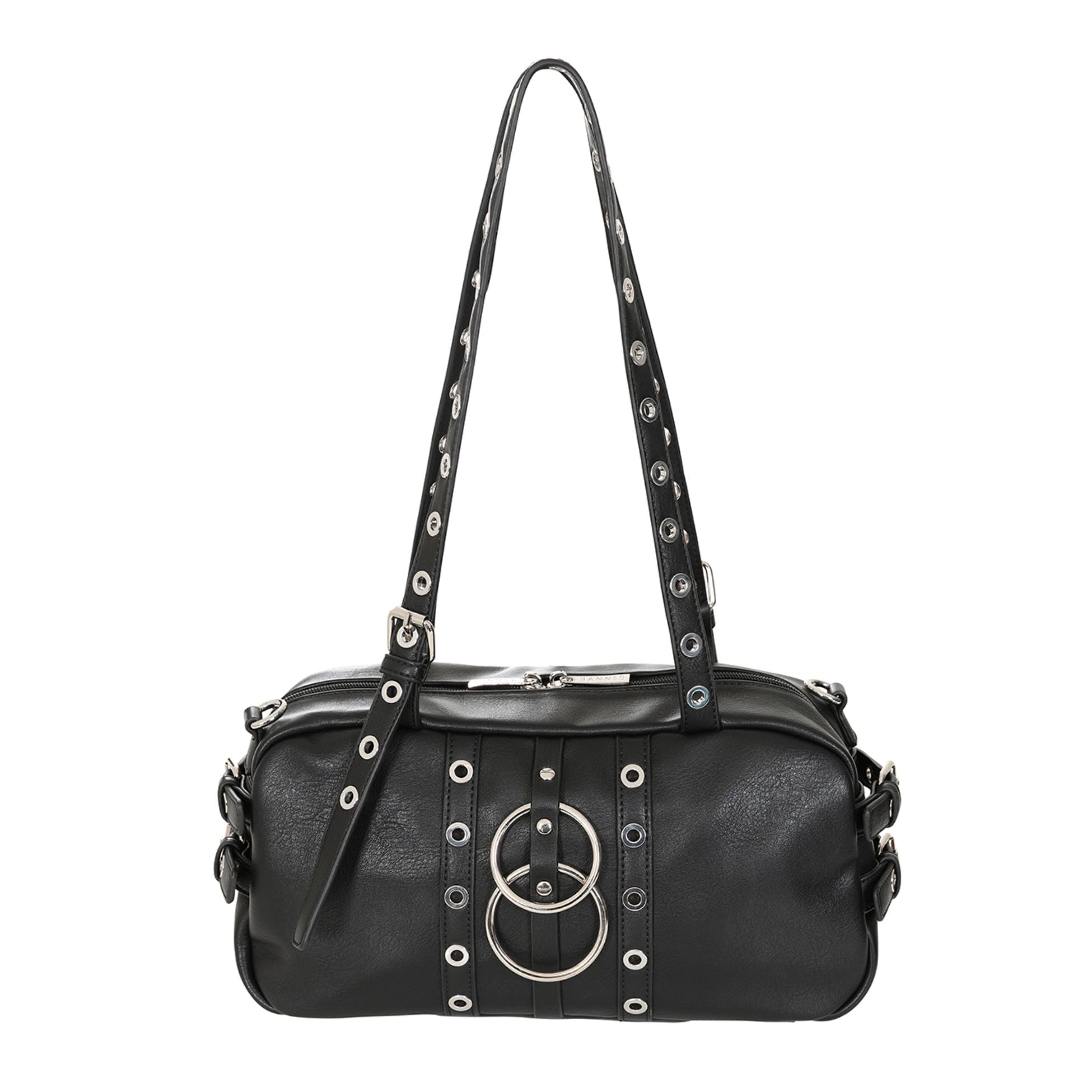 The Circuit Bowler Bag is a sleek vegan leather shoulder bag with double O-ring hardware, grommet straps, on a bowler silhouette. This edgy bag holds medium to small-sized essentials making it a perfect everyday bag.