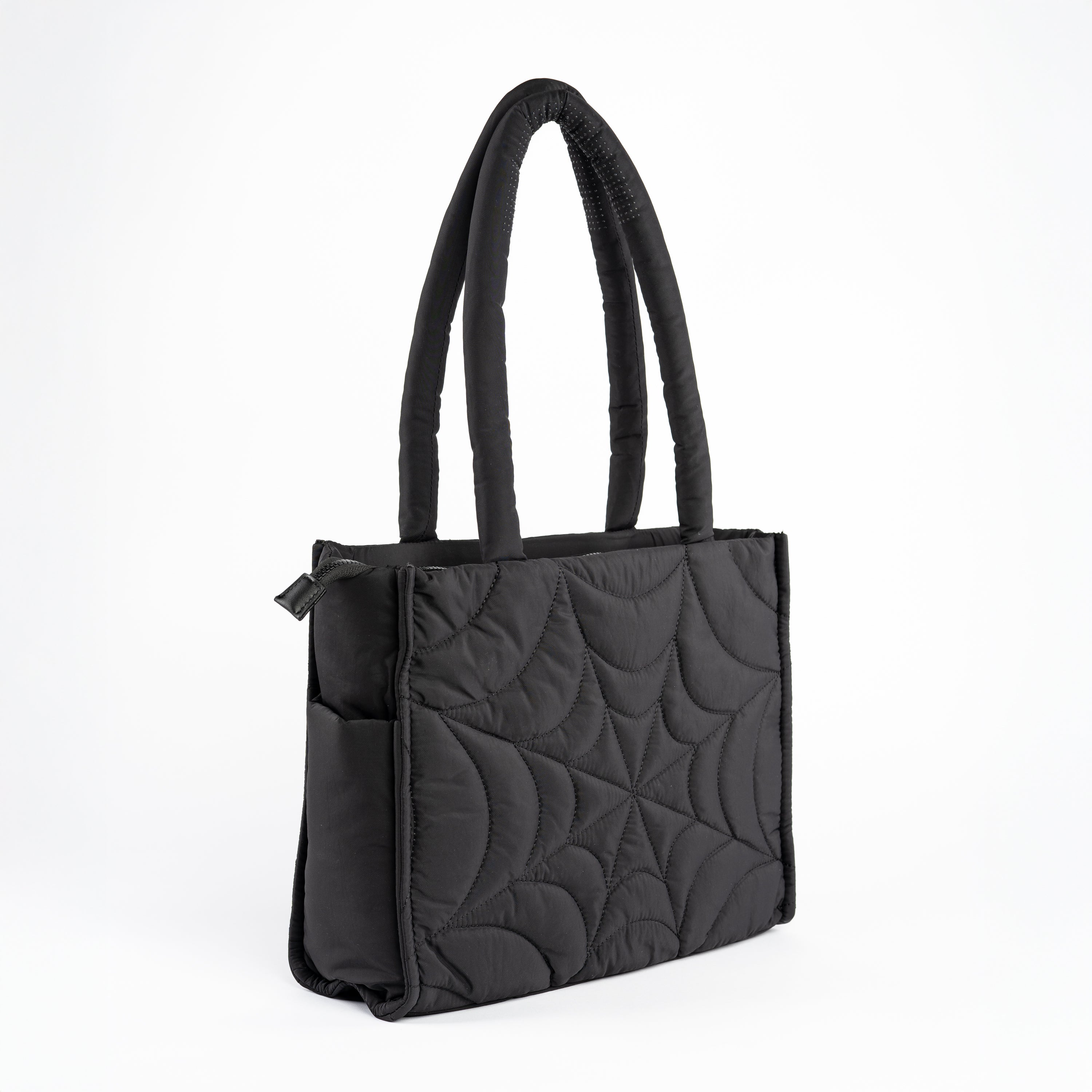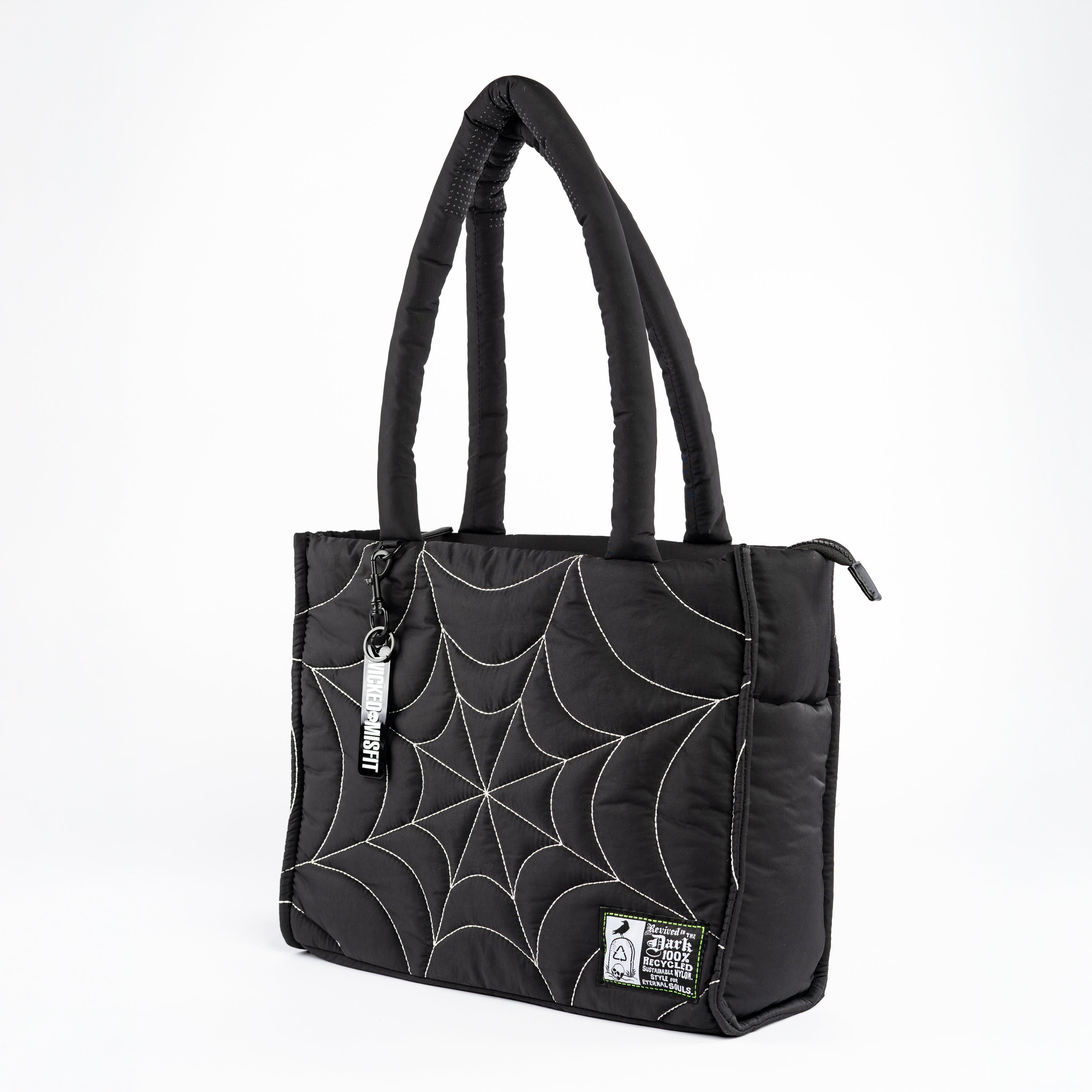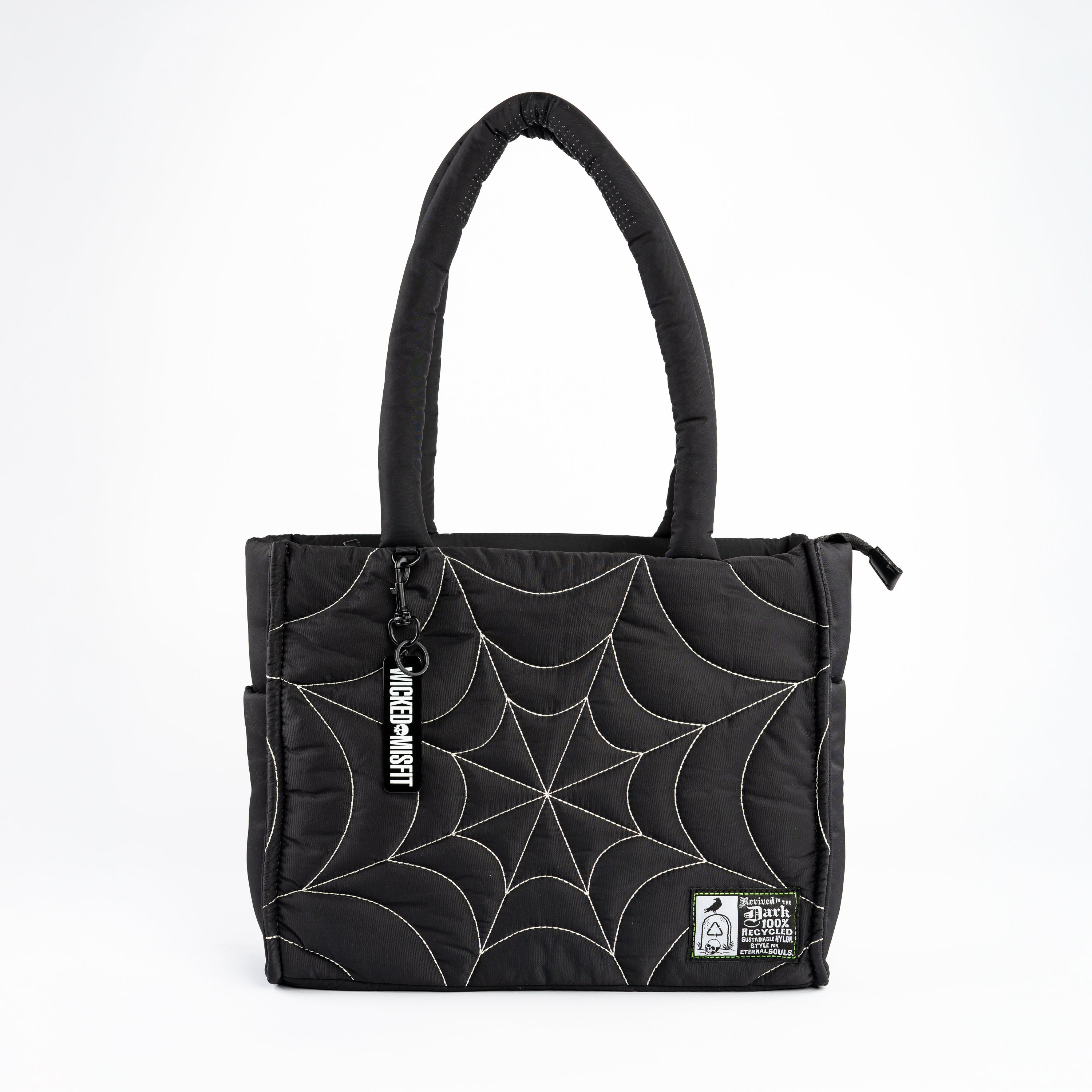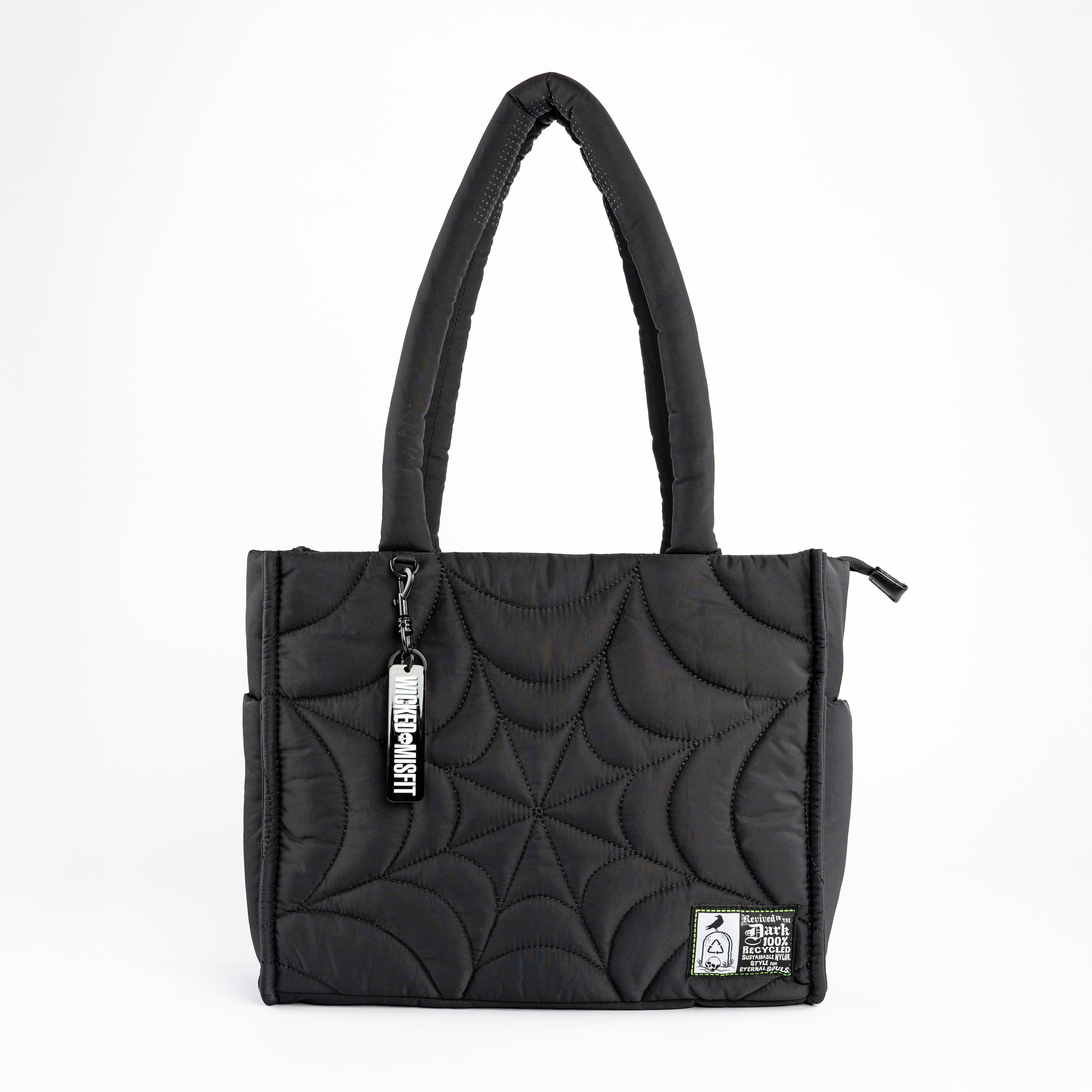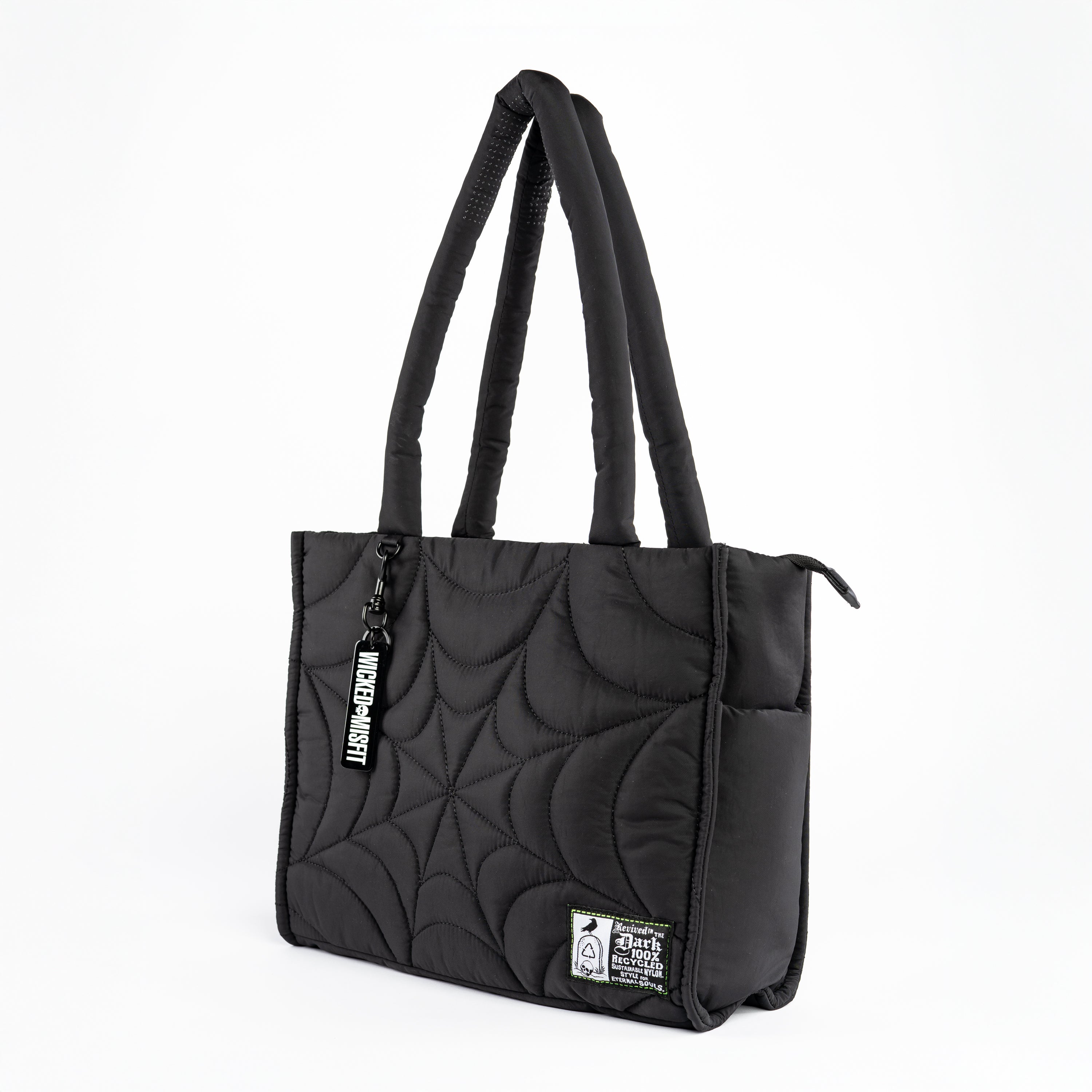 Your new go-to sustainable XL Spiderweb Puff Tote. Crafted from durable recycled nylon, this oversized puff tote is built to carry everything without sacrificing that signature spiderweb design. On the inside, you’ll find a padded tablet sleeve with a secure Velcro closure, two open pockets, and an interior zipper pocket for easy organization. It’s finished with our signature Wicked Misfit charm. Perfect as an everyday carryall, a stylish weekender, or even a spooky diaper bag.