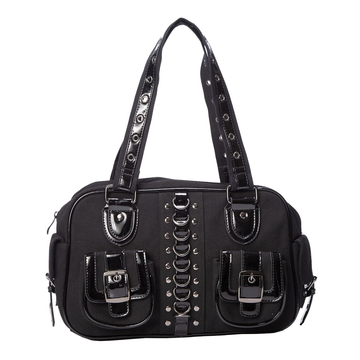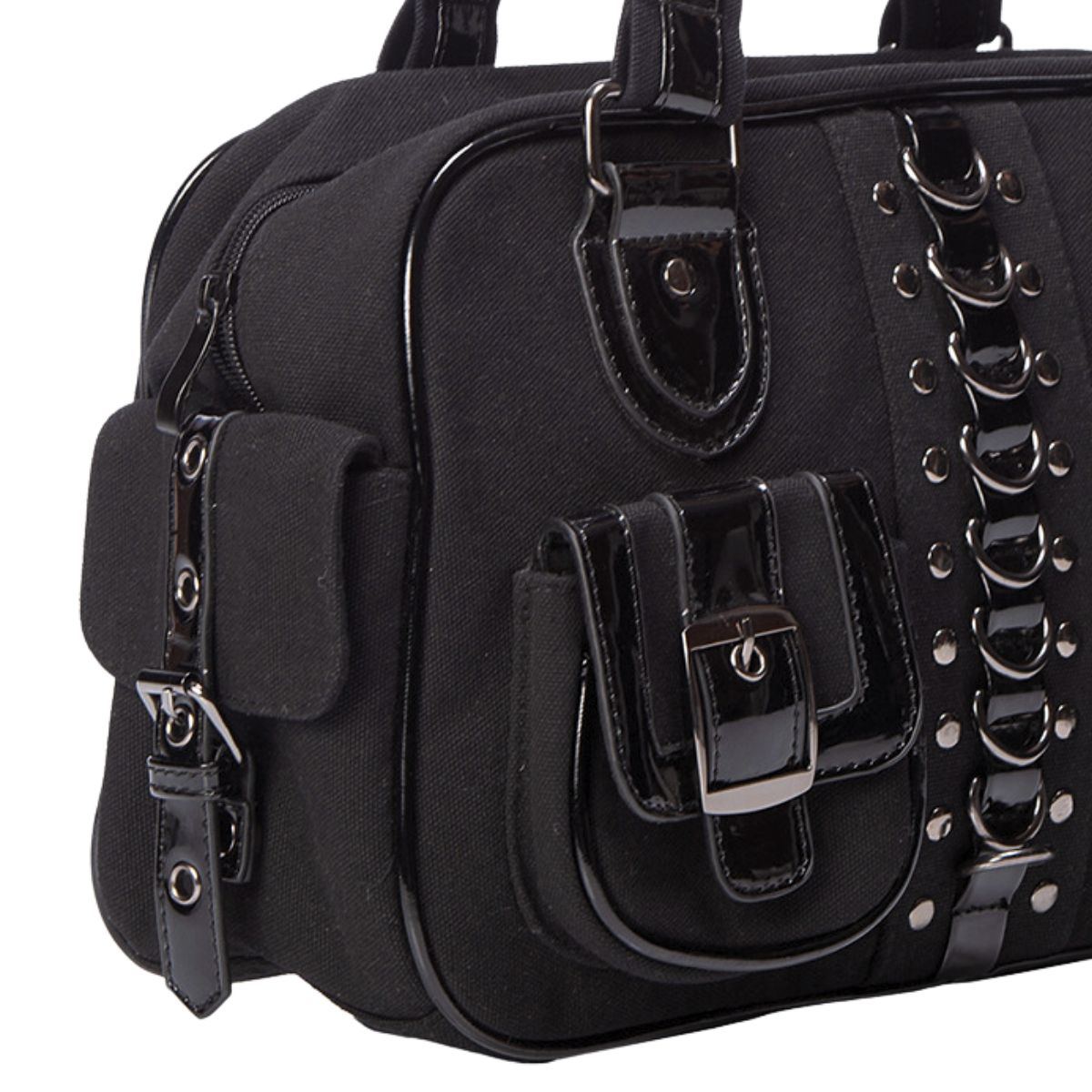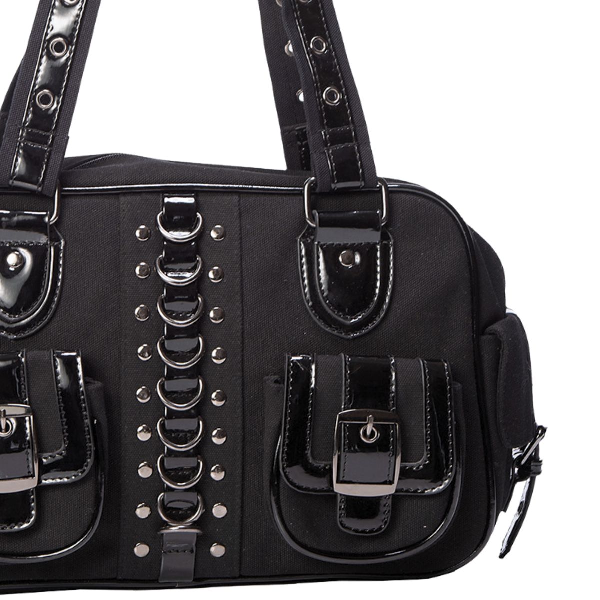 This striking rivet shoulder bag is the perfect everyday carry. Featuring bold D-rings, secure buckle straps, and spacious pockets for your essentials. Crafted from high-gloss vegan leather and durable canvas, it’s sized just right for your medium-sized must-haves.